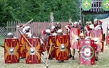 En règle générale, la bataille débutait par un jet de javelots légers, efficaces jusqu'à un maximum de 18 mètres (et souvent beaucoup moins)[8], suivi par des volées de javelots lourds (pila). À la suite de ces salves, les soldats romains marchaient à l'ennemi pour l'engager avec leurs glaives. Comme avec leurs lances, les soldats romains étaient formés à « frapper d'estoc[note 2] » avec leurs épées plutôt que « de taille[note 3] ». Leur entraînement était constant et répétitif, pour s'assurer que la « frappe d'estoc » était utilisée au combat plutôt que le mouvement plus naturel de « frappe de taille ». Pour encourager le soldat romain à approcher dans les deux mètres son ennemi (comme il était tenu de le faire pour pouvoir l'engager avec le glaive), il était fait « citoyen » après le terme de son service[8].