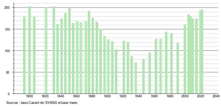 L'évolution du nombre d'habitants est connue à travers les recensements de la population effectués dans la commune depuis 1793. Pour les communes de moins de 10 000 habitants, une enquête de recensement portant sur toute la population est réalisée tous les cinq ans, les populations légales des années intermédiaires étant quant à elles estimées par interpolation ou extrapolation[15]. Pour la commune, le premier recensement exhaustif entrant dans le cadre du nouveau dispositif a été réalisé en 2004[16].