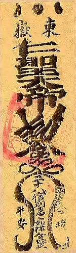 Les talismans (fu 符) sont des pièces de bois ou de métal, plus récemment de papier coloré (en gén. jaune, rouge ou bleu) couverts de signes figuratifs ou de symboles abstraits, écrits à l’encre noire ou rouge[7]. Dans les milieux taoïstes, ils étaient vus comme des écrits d’origine céleste, des édits du monde spirituel ou des ordres venant d’une divinité, aptes à faire trembler les fantômes et les démons et à les maintenir sous contrôle.