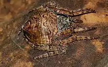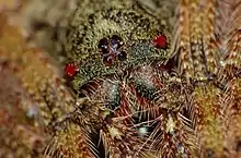La carapace est rouge-orange avec de fines setae blanches et de courtes setea noires. L'extérieur de la profonde rainure cervicale est recouvert de petites granules avec des setae. Des sillons radiaux sont présents et la fovéa est transversale. La carapace présente un tubercule pointu à l'angle latéral de la marge antérieure[3].