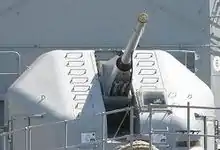 Le canon de 100 mm de la frégate de surveillance Prairial scellé par une tape de bouche.