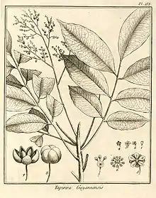 LE TAPIRIER de la Guiane.Cet arbre eſt très grand. Son tronc s'élève à quarante ou cinquante pieds, ſur deux ou trois pieds de diamètre. Son écorce eſt liſſe & rouſſâtre. Son bois eſt blanc, peu compacte. Il pouſſe à ſon ſommet un grand nombre de branches rameuſes ; celles du centre ſont droites, les autres ſont horiſontales, & ſe répandent en tous ſens. Les rameaux ſont chargés de feuilles alternes, à deux rangs & folioles oppoſées, & quelquefois ces folioles ne ſe trouvent pas préciſement l'une vis-a-vis de l'autre. Les deux rangs ſont terminés par une impaire. Le nombre de chaque rang varie, tantôt il eſt de quatre, tantôt de cinq. Ces folioles ſont vertes, liſſes, minces, entières, ovales, terminées par une longue pointe. Les plus grandes out ſix pouces de longueur, ſur deux & demi de largeur. Les inférieures de chaque rangée ſont plus petites que celles qui ſont au deſſus, & ainſi de ſuite. elles ſont portées ſur une côte preſque cylindrique, longue de huit à neuf pouces, groſſe & charnue à ſa baſe.