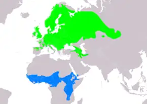 C'est un oiseau migrateur qui niche en Europe et en Asie occidentale, et qui hiverne en Afrique (en milieux ouverts, cultivés ou non tels que respectivement savane, jachères et champs de manioc, coton, etc.)[9],[10],[11].