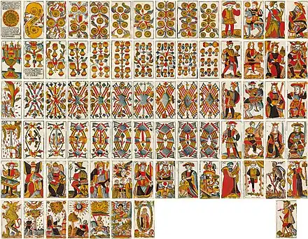 Ce tarot de 78 cartes au format 69 × 126 mm n'est pas considéré comme appartenant à la tradition des tarots de Marseille car il comporte des cartes qui ne suivent pas sa trame : l'atout XIIII, habituellement allégorie de la Tempérance, représente une femme versant un vase dans un autre posé au sol avec un phylactère portant la mention SOL FAMA ; l'atout XV représentant un diable ailé seul, se déplaçant ; l'atout XVI, allégorie de la foudre, représente un berger, accompagné de son troupeau, s'approchant d'un arbre ; l'atout XVII, carte des étoiles, représente comme dans d'ancien tarot italiens illustrés d'astronomes, un personnage assis tenant un compas et un livre, ainsi que cinq étoiles et une tour ; l'atout XVIII, associé à la Lune, représente une femme tenant un fuseau assise sur une pierre devant un arbre, sous l'astre lunaire ; l'atout XIX représente l'astre solaire sous lequel passe un jeune homme ou un enfant à cheval.