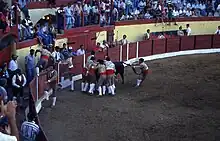 La tauromachie (du grec tauros, « taureau » et makheia, « combat ») est la manière d’affronter le taureau[note 1], soit lors de combats à l’issue desquels le taureau est mis à mort, soit lors de jeux, sportifs ou burlesques comme les taurokathapsies[note 2].