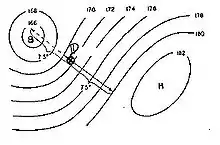 - La différence de hauteur de la 500 hPa pour des points situés à 7,5 degrés de latitude de part et d'autre de la dépression de surface. On mesure perpendiculairement au courant et on n'inclut que les contours ouverts