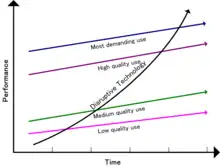 Cette disparition de la technologie existante se fera bien que la technologie de rupture soit radicalement différente et qu’elle soit souvent moins performante à l’origine selon les critères traditionnels de mesure. Une technologie de rupture survient et domine un marché déjà existant soit en remplissant une fonction que la technologie traditionnelle ne pouvait pas remplir pour une application particulière (comme ce fut le cas des petites disquettes initialement plus chères et de capacité réduite développées pour les ordinateurs portables) ou bien en augmentant progressivement les parts de marché au fur et à mesure que les performances augmentent, jusqu’à remplacer ceux qui étaient établis sur le marché (comme ce fut le cas avec la photographie numérique).