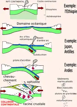 On admet à présent que les plaques tectoniques sont portées par les mouvements du manteau asthénosphérique sous-jacent, et subissent des interactions dont les trois types principaux sont la divergence, la convergence, et le coulissage. À ces trois types d'interaction sont associées les trois grandes familles de failles :