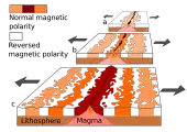 En 1958 et 1961, les océanographes Ron G. Mason (en) et Arthur D. Raff mettent en évidence des bandes d'anomalies magnétiques symétriques par rapport à l'axe des dorsales océaniques, corrélables avec les phénomènes d'inversion du champ magnétique terrestre[11],[12]. Le géophysicien Drummond Matthews et son étudiant Frederick Vine interprètent cette disposition surnommée « peau de zèbre » comme la confirmation de l'hypothèse d'Hess : l'accrétion de matériau mantellique au niveau des rifts et la dérive de la croûte océanique portée par le manteau sous-jacent qui agit comme un tapis roulant de part et d'autre du rift, sont à l'origine de cette disposition caractéristique[13].