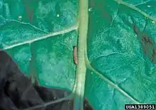 - Les chenilles mineuses s'attaquent à toutes les parties végétatives de diverses Solanacées sauvages ou cultivées, et en particulier du tabac et de la pomme de terre. Elles creusent des galeries tapissées de fils de soie dans les feuilles, tiges et tubercules, rejetant leurs excréments noirâtres à l'extérieur. Ces galeries peuvent ensuite être envahies par des bactéries (Bacillus amylobacter) ou des acariens, dont l'acarien des racines, (Rhyzoglyphus echinopus)[2].