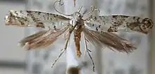 L'imago mesure 10 à 12 mm d’envergure et ses ailes antérieures sont blanchâtres mouchetées de taches brunes. Il est nocturne et attiré par la lumière.