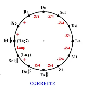 - Les tierces Si-Ré, Fa-La, Do-Mi, Sol-Si, Ré-Fa et La-Do sont bonnes, corrigées de 2/3 de comma et les deux quintes augmentées d'un tiers de comma sont placées de telle façon qu'aucun véritable loup ne se manifeste.