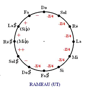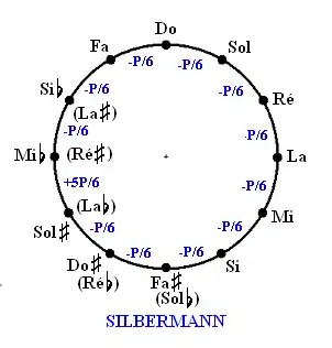 - Le comma pythagoricien est réparti par cinquièmes sur 5 quintes (qui deviennent ainsi un peu courtes) : Do-Sol, Sol-Ré, Ré-La, La-Mi et Si-Sol.