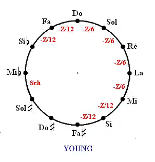 Le tempérament de Young favorise la tierce majeure do-mi, avec 4 quintes réduites d’un 1/6 de comma syntonique. Les 4 quintes plus distantes (si-fa et fa-do ainsi que mi-si et si- fa) ne sont réduites que d’un 1/12 de comma.