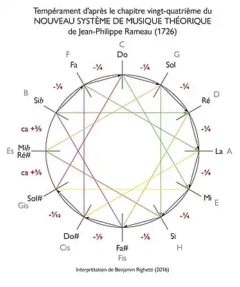 Jean-Philippe Rameau décrit la façon d'établir ce tempérament dans le dernier chapitre de son second traité intitulé Nouveau système de musique théorique. Il y a sept quintes diminuées d'un quart de comma syntonique et donc quatre tierces pures.
