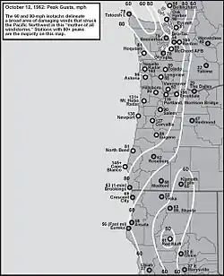 Des rafales de vent de 93 km/h et plus, dépassant le critère de vents violents du National Weather Service et du Service météorologique du Canada, furent enregistrées de San Francisco en Californie à Vancouver en Colombie-Britannique[6]. Les vents violents atteignirent aussi loin à l'intérieur des terres que Spokane dans l'État de Washington[6]. Plusieurs anémomètres furent emportés par le vent en Oregon et dans l'État de Washington, dont celui des studios de radio-télévision KGW à Portland.