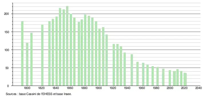 L'évolution du nombre d'habitants est connue à travers les recensements de la population effectués dans la commune depuis 1793. Pour les communes de moins de 10 000 habitants, une enquête de recensement portant sur toute la population est réalisée tous les cinq ans, les populations légales des années intermédiaires étant quant à elles estimées par interpolation ou extrapolation[48]. Pour la commune, le premier recensement exhaustif entrant dans le cadre du nouveau dispositif a été réalisé en 2005[49].