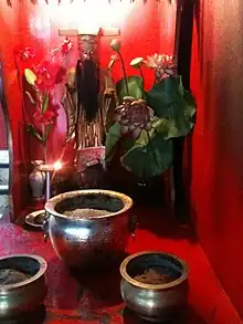 Devant Guan di, 3 grandes tables ornées de bougies et de vases dans lesquels sont mis les fameux bâtons d'encens. La plus grande table est utilisée lors des cérémonies.