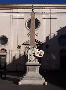 Cet obélisque, dont seule la pointe est antique, est considéré comme le jumeau de l'obélisque du Panthéon. Il porte des inscriptions en hiéroglyphes, avec le cartouche de Ramsès II. Il a probablement été transporté à Rome sous Domitien, en même temps que d'autres, comme celui des Thermes (dit de Dogali), ou celui de la piazza della Minerva, pour orner les propylées des temples d'Isis et de Sarapis, au Champ de Mars[5]. Au Moyen Âge, cependant, il se trouvait sur le Capitole[6].