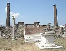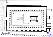 Le temple reconstruit au IIe siècle av. J.-C. est édifié sur un podium élevé et accessible par un escalier en façade (sud-est) ; il est situé dans le fond de l'aire sacrée. Il s'agit d'un monument périptère (des colonnes libres entourent la cella et le pronaos) hexastyle (la façade est scandée de six colonnes) ouvert au sud-est et dont les grands côtés comportent 10 colonnes, toutes surmontées de chapiteaux corinthiens[15].