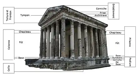 Aujourd'hui, l'édifice possède une longueur totale de 27 mètres sur une largeur de 14,25 mètres et sur une hauteur de 17,36 mètres[3], dont 9,70 m pour la colonnade[4]. C'est un temple du type pseudo-périptère sine postico[5] (la colonnade arrière est remplacée par un mur) dont la forme est celle d'un parallélogramme[6]. Il s'élève sur un podium haut de 2,75 mètres présente six colonnes cannelées en façade et six sur les côtés latéraux (en comptant la colonne d'angle) qui se prolongent par le retour du mur postérieur flanqué de deux pilastres engagés. La cella reconstruite est précédée d'un vestibule auquel on accède par un large escalier frontal. L'ordre est corinthien, l'entablement classique est peu décoré (modillons de la corniche)[A 1].