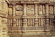 Les décorations sculptées offrent une grande variété de thèmes, descriptions de scènes de la vie quotidienne riche en enseignements, comme celle d'un temple qui rassemble en un même lieu des représentations d'un lingam et d'un Jagannâtha, une preuve de la tolérance religieuse des dirigeants locaux, ou comme celle de la présentation d'une girafe, peut-être par des émissaires africains, au râja monté sur un éléphant. Une frise d'oies ou de fleur à quatre pétales couronne les faces, surmontant une autre frise représentant une armée en marche, une rangée d'éléphants, etc.