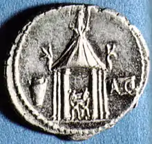 L'édifice même consacré à Vesta n'est pas un templum (un espace consacré)[1], bien que les poètes le qualifient quelquefois ainsi[a 7]. Il s'agit par contre d'une aedes (temple). Selon Ovide, sa forme ronde avec un foyer au milieu est une représentation symbolique de la Terre, avec son feu central et immobile[a 8]. Georges Dumézil rend compte de la forme ronde du temple de Vesta par une comparaison avec celle du foyer du maître de maison et voit dans cette forme un lien avec la Terre[2]. Les historiens modernes font aussi un rapprochement avec un rite funéraire très ancien observé à Rome, consistant à recueillir les cendres du défunt après crémation, à les placer dans une urne ronde en forme de cabane (urne-cabane) qu'ils inhumaient. On ne peut toutefois pas tirer de ces similitudes symboliques d'autres conclusions que l'extrême ancienneté de ce culte et son caractère autochtone.