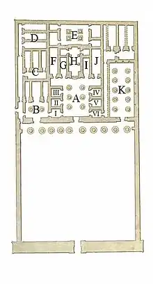 Plan du temple.A Salle hypostyle. B Temple dédié à Ramsès Ier. C Culte funéraire royal. D Salles d’abattage. E Salle à colonnes. F Sanctuaire de Ptah. G Sanctuaire de Mout. H Chapelle-reposoir de la barque d'Amon. I Sanctuaire de Khounsou. J Sanctuaire d'Osiris. K Cour du culte solaire. I à VI annexes.