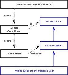 L'International Rugby Hall of Fame Trust est une association à but non lucratif néo-zélandaise. Son conseil d'administration est composé de dix à vingt personnes nommées de manière à représenter les nations majeures de rugby. Ce conseil est chargé d'élire les nouveaux Hall of Famers tous les deux ans[5]. La grande majorité des membres ont été nommés au Temple de la renommée avant leur désignation au conseil d'administration[6].
