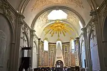 Les murs de la nef et du chœur sont décorés d’arcades en plein cintre avec des ornements en stuc. Le chœur est habillé de plaques de marbre, la voûte de l’abside a des ornements dorés.