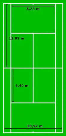 Comme présenté sur l'image ci-contre, le court de tennis doit être de 23,77 mètres (soit 26 yards) de long pour 8,23 mètres (9 yards) de large. Cela représente donc 11,89 mètres (13 yards) de longueur de chaque côté du filet, et 8,23 mètres de largeur pour une rencontre de simple, où les couloirs latéraux ne sont pas comptabilisés. Pour le jeu en double, deux couloirs de 1,37 mètre sont ajoutés. La largeur du court de double est donc de 10,97 mètres (12 yards). Sur le terrain, on retrouve cinq sortes de lignes différentes :