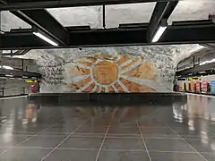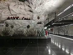 La décoration artistique de la station a été faite par Helga Henschen (sv) sur le thème d' Une rose pour les immigrés (En ros till invandrarna en suédois). Ce thème comporte comme maître-mot, la fraternité. 18 toiles de peintures furent peintes, et chaque toile est écrite avec une langue différente.