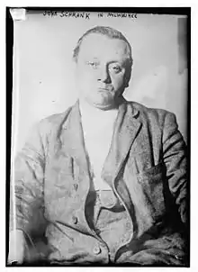 John Flammang Schrank (5 mars 1876 - 15 septembre 1943) était un tenancier de bar d'origine bavaroise de New York[16]. Roosevelt, qui avait quitté ses fonctions trois ans et demi plus tôt, était candidat à la présidence en tant que membre du Parti progressiste. Lors d'un discours de campagne de Roosevelt à Milwaukee, Schrank, qui le traquait depuis des semaines, a tiré une fois sur Roosevelt dans la poitrine avec un Colt Police Positive Special de calibre .38. Le texte de 50 pages de son discours de campagne replié deux fois dans la poche de poitrine de Roosevelt et un étui à lunettes en métal amortirent l’impact de la balle, lui sauvant la vie. Schrank a été immédiatement désarmé, capturé et aurait pu être lynché si Roosevelt n'avait pas crié que Schrank devait rester indemne.