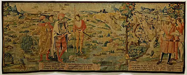 Quatrième pièce de la Tenture, cette longue pièce est divisée en trois scènes par des arbres dont l'un porte la date. Sur la gauche, on voit le roi Belgius, quatorzième roi des Gaules et fondateur de "Belgium" identifiée dans la tapisserie avec la ville de Beauvais. À l'arrière-plan, on peut voir diverses localités du Beauvaisis et notamment la ville de Clermont-en-Beauvaisis dont le commanditaire était originaire. La ville de Beauvais peut être identifiée grâce à sa cathédrale encore en construction au niveau du chevet, mais également grâce aux toits d'ardoise du palais épiscopal[Note 2]. Le roi tient son sceptre de la main droite, tandis que derrière lui une paysanne est en train de pêcher, accompagnée de deux chiens. Au centre, le meurtre du roi Jasius, descendant d'Hercule de Libye, par son frère Dardanus est représenté. Belgius étant mort sans enfant légitime, les Gaulois élurent le roi d'Italie Jasius. Son frère, Dardanus, jaloux de son pouvoir entra en guerre contre lui. Après une apparente soumission, Dardanus assassina son frère et s'embarqua pour la Grèce où il fonda Troie. La tapisserie montre Dardanus s'enfuyant en bateau. À l'arrière-plan, une ville est figurée, il s'agit de Troyes, assimilée à la cité grecque. À droite, au premier plan, le roi Pâris, figuré sous les traits de François Ier, et trois courtisans, sont représentés devant la ville de Paris reconnaissable grâce aux deux tours de la façade de la cathédrale Notre-Dame, mais aussi à la tour Saint-Jacques. Les différents plans de l'œuvre coexistent en dépit des règles de perspective[Note 3]. Sur le côté, apparaissent les armes du commanditaire.