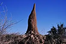 - les termites champignonnistes (en), qui ont la particularité d'établir une symbiose (de type ectosymbiose) avec un champignon lignolytique, champignon supérieur appelé Termitomyces. Cultivé sur des meules (amas de boulettes d’excréments malaxées) au sein de la termitière, le champignon pré-digère les restes de végétaux (lignine et parfois cellulose) afin de les rendre plus facilement assimilables par les termites[11]. Ce sont ces derniers qui édifient de vastes nids (termitières cathédrales) en terre mâchée pouvant atteindre plusieurs mètres de haut[10] ;