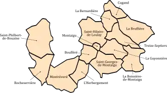 Néanmoins, quatre communes du territoire communautaire n’appartiennent pas au bassin de vie de Montaigu : Saint-Philbert-de-Bouaine se situe dans celui de Saint-Philbert-de-Grand-Lieu (Loire-Atlantique)[26], tandis que La Bernardière, La Bruffière et Cugand sont dans l’orbite de Clisson (Loire-Atlantique)[27].
