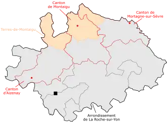 La communauté de communes correspond approximativement au bassin de vie de Montaigu. En effet, sur les quatorze communes constituant le bassin[25], quatre n’appartiennent pas au territoire communautaire et sont membres de Clisson-Sèvre-et-Maine-Agglo[alpha 4], située dans la Loire-Atlantique, ou de la communauté de communes du Pays-de-Saint-Fulgent-les-Essarts[alpha 5].