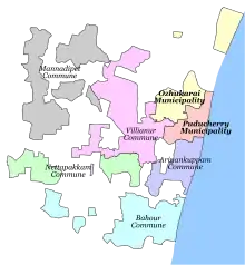 Une des particularités de Puducherry est d'avoir conservé pendant longtemps l'administration municipale et le découpage en communes issu de la colonisation française. Toutefois, le Municipalities Act et le Village and Commune Panchayats Act de 1973 ont rapproché l'administration locale de ce qui existe dans les autres États en transformant les plus grandes villes en municipalités et en instaurant le système des panchayats dans les communes subsistantes[16].