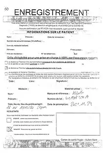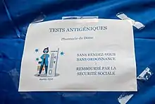 Il existe trois tests antigéniques autorisés en France : le test antigénique nasopharyngé (réalisé par des professionnels), le test antigénique nasal (réalisé par des professionnels) et l'auto-test antigénique nasal (réalisé par la personne elle-même) qui peut être supervisé par un professionnel pour l'obtention du pass sanitaire. Les tests par prélèvement nasal au lieu de nasopharyngé sont moins profonds[28],[42]. Il existe également des tests antigéniques salivaires mais qui ne sont plus remboursés car pas assez fiables, contrairement aux tests PCR salivaires[43].