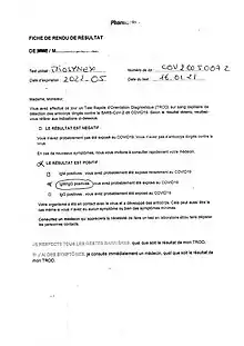 Ces tests (appelés lateral flow tests en anglais) donnent un résultat en 15 minutes à 30 minutes, et sont fondés sur la recherche d'antigènes du virus[34]. Les premiers test arrivés sur le marché avaient, en juin 2020, une sensibilité assez modeste (60,2 %) et une très bonne spécificité (99,2 %). Leurs successeurs, dès l'automne 2020, offrent des sensibilités et spécificités supérieures à 95 %[35]. Les capacités de production sont cependant, au début de l'été 2020, faibles[36],[37] en comparaison des besoins pour opérer un déconfinement[38] de la population dans les conditions les meilleures. Contrairement à ce qui est rapporté par de nombreux médias la sensibilité du test majoritairement disponible en France[39] (Abbott), de 93 %[40] pourrait sembler meilleure que celle des tests PCR[41].