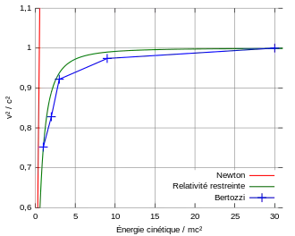 William Bertozzi, en 1962 et en 1964, mène une série d'expériences visant à déterminer les effets relativistes de façon directe. Il emploie un accélérateur d'électrons du MIT qui effectue cinq jets d'électrons d'énergies différentes entre 0,5 et 15 MeV. Chaque jet est créé à l'aide d'un générateur de Van de Graaff : les électrons voyagent sur 8,4 m jusqu'à ce qu'ils frappent un disque en aluminium. Le temps de vol de chaque jet est mesuré – la vitesse atteinte est en proche accord avec les prédictions de la relativité restreinte. Néanmoins, l'énergie cinétique est déterminée indirectement à l'aide de l'énergie dégagée par les champs d'accélération. Bertozzi mesure alors l'élévation de température causée par les collisions des électrons contre le disque. Il obtient des énergies cinétiques qui sont en accord à 10 % près des prédictions relativistes[8],[9].
