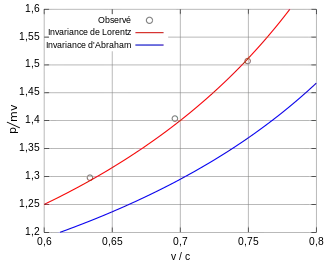 Les premières expériences pouvant déterminer si de telles relations sont vraies ont été conduites par Walter Kaufmann, Alfred Bucherer et Carl Neumann entre 1901 et 1915. Elles ont principalement portées sur la déflexion de rayons bêta soumis à un champ magnétique dans le but de déterminer le rapport masse sur charge de l'électron. En effet, les scientifiques savaient que la charge électrique est indépendante de la vitesse de cette particule ; toute variation pourrait alors être attribuée à une modification de la quantité de mouvement ou à la masse (qui était connue à cette époque comme la masse électromagnétique (en) transverse , équivalente à la masse relativiste mentionnée plus haut). Ces tests servent à valider l'énergie et la quantité de mouvement relativistes, puisque la relation suivante s'applique :