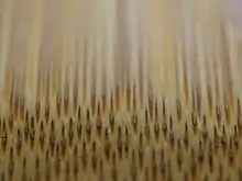 - le rentrage : les fils de chaîne sont enfilés dans des tiges métalliques (les lisses) puis dans les dents du peigne ;