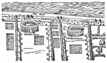 Au milieu du XVIe siècle, les troupes de comédiens ne disposent pas de bâtiments réservés aux représentations. Aussi dressent-elles leurs tréteaux dans des lieux divers : cours d'auberge, granges, écoles, squares urbains[31] ou dans les arènes destinées aux combats d'animaux (coqs, ours, taureaux ou chiens). De là viendrait la forme cylindrique caractéristique des théâtres élisabéthains, rappelant l'arène centrale où se déroulaient ces combats[32]. Confirmant cette hypothèse, un des théâtres régulièrement utilisés au XVIe siècle s'appelle le Théâtre du Cockpit, dont le nom rappelle sa destination première : les combats de coqs[33]. Dans les arrière-cours des auberges, les troupes ambulantes dressent leur scène contre un corps de bâtiment, les spectateurs pouvant se placer dans la cour même, près de la scène, ou, en hauteur, aux fenêtres des chambres des étages. Certains établissements hôteliers, comme le Bel Savage Inn à Ludgate Hill, le Cross Keys Inn et The Bell Inn dans Gracechurch Street, et le Bull Inn dans Bishopsgate, tous les quatre à l'intérieur de la City, sont ainsi aménagés en théâtres dans le courant du XVIe siècle[34],[35].