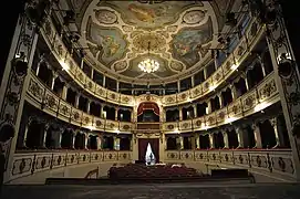 L'intérieur est structuré en forme théâtrale de fer à cheval, avec 32 loges (dont la loge royale) réparties sur 3 niveaux de balcons, et un plafond voûté richement décoré d'un lustre, de quatre anges, et de quatre fresques allégoriques représentants la comédie, la tragédie, le mélodrame et le drame romantique[5].