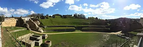 Dans le dernier quart du IIIe siècle, le théâtre abandonne son rôle d'édifice de spectacles. Ses structures sont récupérées. La plupart des vomitoires et des accès sont murés, transformant le théâtre en forteresse[26] ; la ville elle-même est alors pourvue d'une enceinte mais il est impossible de dire si le théâtre est intégré à cette enceinte ou s'il en constitue une sorte de poste avancé[27]. Des bains sont construits dans l’arène, à l’aide de blocs de remploi provenant de monuments funéraires, mais on ignore encore à qui ils étaient destinés.
