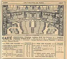 Plan du Théâtre de la Gaîté en 1925 avec prix des places et administration.