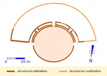 Sa cavea, qui ne forme pas tout à fait un demi-cercle, ce qui le rapproche de l'édifice du site gallo-romain de Montbouy, possède un diamètre de 94 m et sa capacité est estimée à 5 000 personnes. Certains gradins, près de l'arène, sont aménagés pour les notables, le reste de la cavea étant composé d'une pente de terre retenue par un contrefort à l'arrière. Les spectateurs prennent peut-être alors place sur des gradins en bois, dont les clous de fixation sont retrouvés lors des fouilles [11].