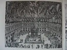 En Bavière on atteint l’extravagance dès 1574. Les ducs de Bavière encouragent et financent généreusement les représentations théâtrales du collège jésuite. On joue ‘Constantin’ une tragédie, sur une place publique de Munich. La représentation dure deux jours. Mille acteurs sont mis à contribution. Toute la ville est décorée pour l’occasion. La foule est considérable, y compris sur les balcons et les toits des maisons avoisinantes. On remet cela pour la représentation d’Esther en 1577, et mieux encore lors du ’Triomphe de saint Michel’, joué en 1597, lors de la dédicace de l’église Saint-Michel offerte par le duc aux jésuites. Procession et défilé religieux à travers la ville, 900 choristes, et à la fin de la représentation pas moins de 300 diables chassés par saint Michel vers les flammes de l’enfer[2].