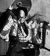 Parmi les plus anciens spectacles importés d’Asie figure le gigaku, apporté de Corée en 612 selon la tradition. Il s’agit en réalité d’un ensemble assez hétérogène de divertissements en vogue en Chine et en Corée, mêlant processions, danses, farces et pantomimes[19]. Au Japon, les spectacles gigaku sont d’abord tenus à l’occasion des fêtes bouddhiques, puis intégrés aux cérémonies de la cour[8]. Trait caractéristique du genre, les acteurs portent de grands masques de laque sèche ou de bois peignant avec des expressions caricaturales des personnages étranges et exotiques pour les Japonais d’alors[20]. Toutefois, le gigaku disparaît assez rapidement des grands centres, et dès le Xe siècle, cette tradition était marginale, si bien que nous n’en connaissons que peu de choses de nos jours[21], hormis par les documents anciens comme le Kyōkunshō écrit en 1233 par Koma Chikazane[22]. Cet abandon s’explique peut-être par le caractère parfois grossier du gigaku, par exemple la danse mara-furi (« secouer le phallus ») où un danseur mène en laisse un personnage représentant un phallus[23].